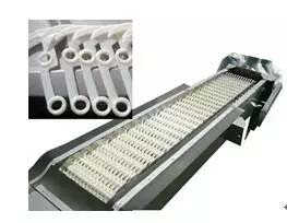 回转式齿耙(ABS)链条格栅由链轮驱动装置牵引密布的耙齿组(材质为ABS)将拦截在耙齿前的漂浮和悬浮物体打捞上来的格栅除污机。回转式链条格栅具有自动化程度高、分离效率高、动力消耗小、无噪音、在无人看管的情况下可保证连续稳定工作的特点,但回转式齿耙(ABS)链条格栅在使用过程中ABS材料耙齿经太阳暴晒、风吹雨淋容易老化变脆、可塑性变差、容易破裂,影响整体效率,目前已被尼龙耙齿、不锈钢耙齿代替。