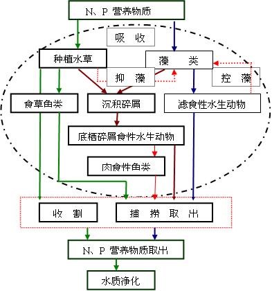 生态净化系统的设计和构建的核心是依据生态原理,形成多层次的水生生物系统,构建食物链,降解、固定或转移污染物和营养物,并通过这个过程净化水质。其模式图如下: