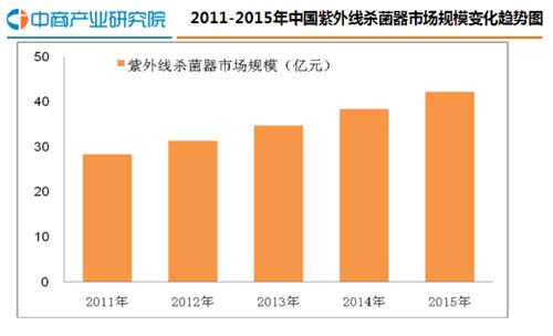 近几年,我国紫外线杀菌器在水处理行业普及率在不断提高,带动了对紫外线杀菌器需求的不断增加,增速为10%左右,2015年我国紫外线杀菌器行业市场规模达42.2亿元。