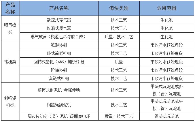 淘汰目录以技术或者工艺落后而淘汰、质量不达标淘汰、制造过程高耗能等不符合绿色发展而淘汰为编制原则,经征集、专家评审后发布。第一批淘汰目录包含曝气器、格栅、刮吸泥机。